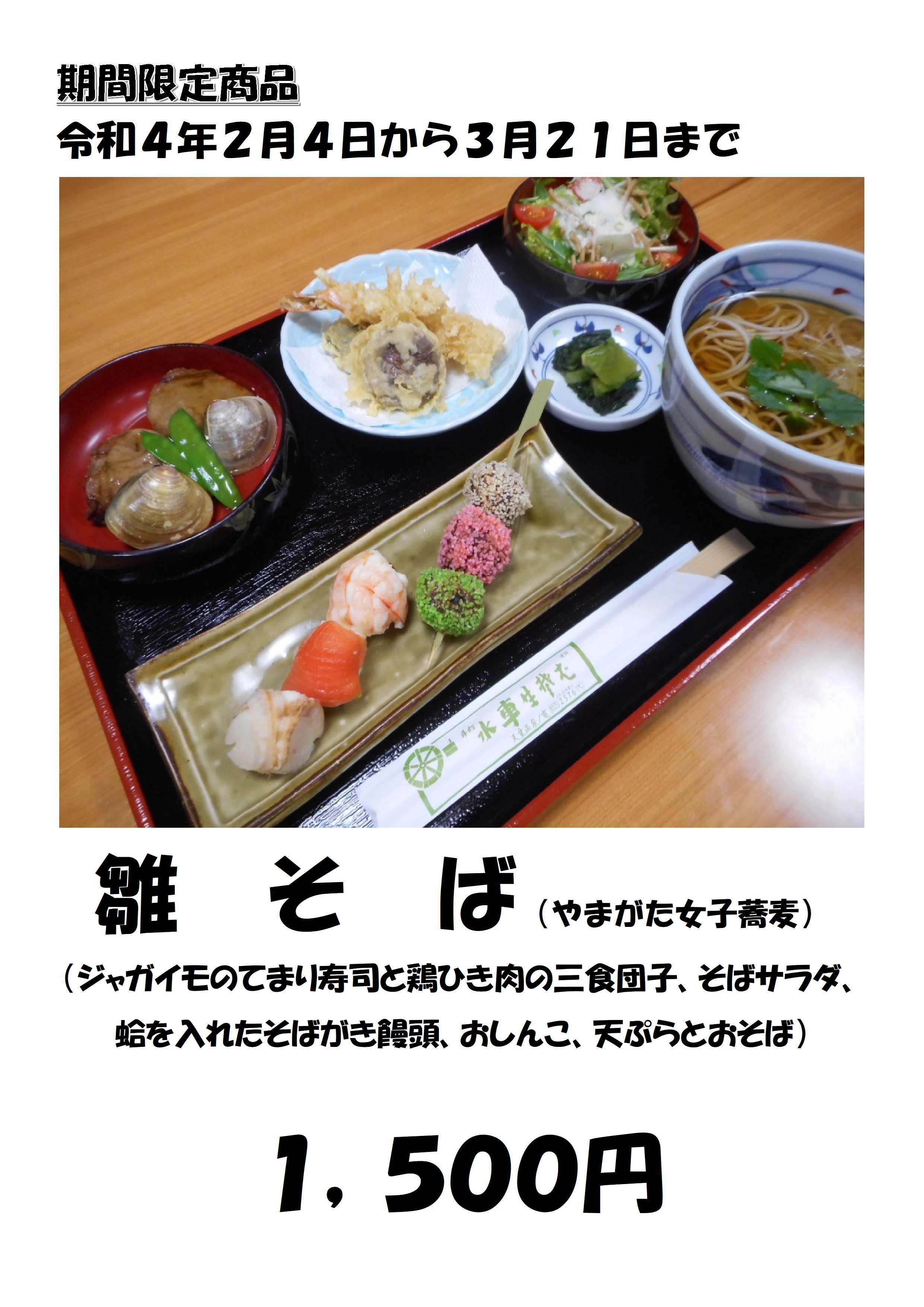 2022年01月18日 【期間限定商品】雛そば&やまがた女子蕎麦 期間限定商品(令和4年2月4日から3月21日まで) 雛そば&やまがた女子蕎麦 前の記事へ お知らせ一覧 次の記事へ 営業時間のご案内 天童 手打水車生そば 〒994-0025 山形県天童市鎌田本町1丁目3-26(天童温泉) 営業時間 11:00~23:00 休日:元旦 Tel:023-653-2576 Fax:023-653-2579